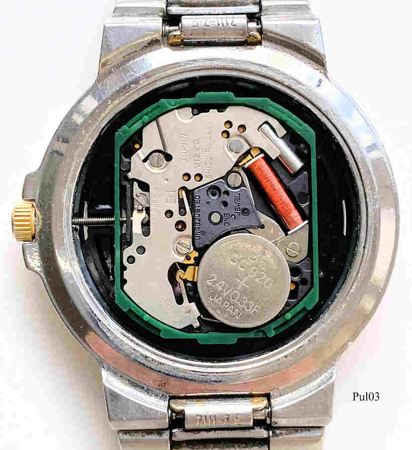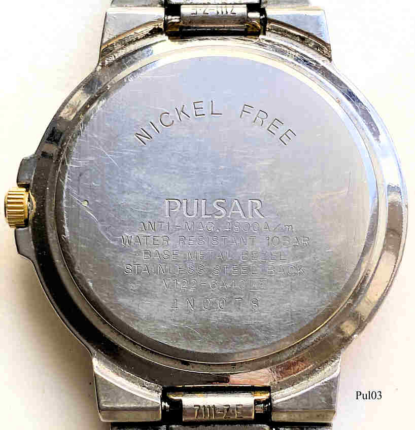 Dies ist eine Pulsar Solar Uhr mit Base Metal Gehäuse. Das Zifferblatt ist schwarz mit Datumsfenstern. Auf die Solarelemente ist ein Ring mit Minuteneinteilung aufgesetzt, das Gehäuse ist Base Metal. Beschriftet:”Pulsar, Solar, Water 100 M Resistant, Japan V122-6A40-SR2 ” Rückseite:” Nickel Free, PULSAR,Anti-Mag. 4800 A/m, Water Resistant 10 Bar, Base Metal Bezel, Stainless Steel Back, V122 6A40 A0, 4N0078”