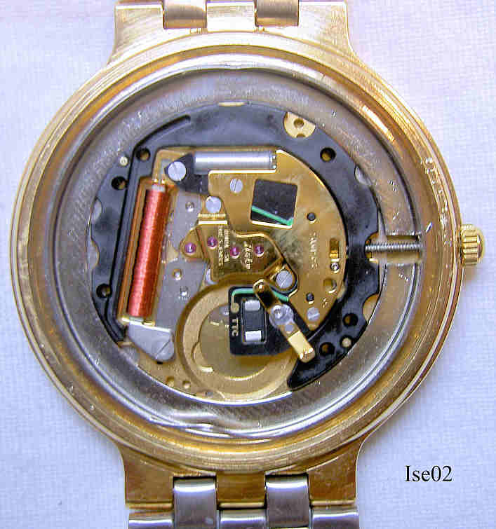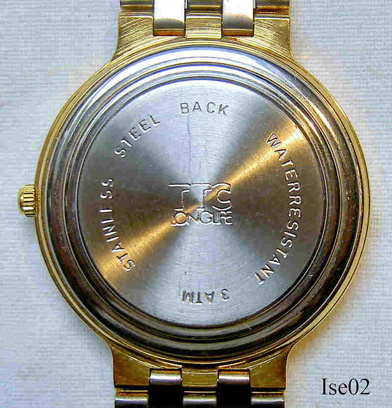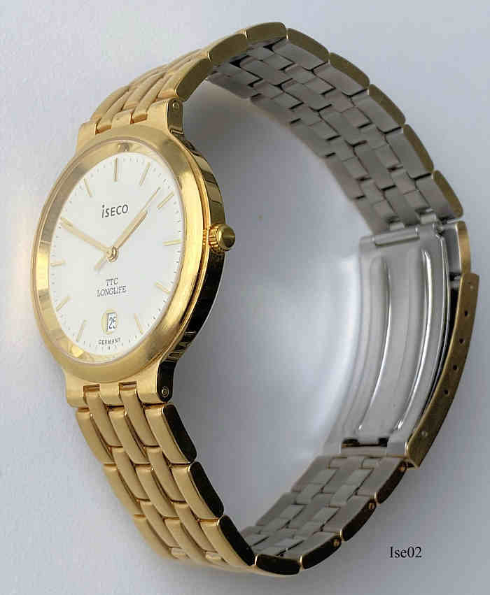 Eine Iseco Uhr mit klarem weißen Zifferblatt, Datum bei der 6. Beschriftet vorn: ”Iseco, TTC, Longlife, Germany”, hinten: “Stainless Steel Back, Water resistant 3 ATM, TTC Longlife”, innen: “Swiss, Harley, Ronda SA:, Five 5 Jewels, DAD”. Longlife bezieht sich auf die Lithium Jod Batterie, die die Uhr 20 Jahre Garantiert antreiben soll. Die ganze Rückwand ist die Batterie. Kaliber Harley Ronda DAD