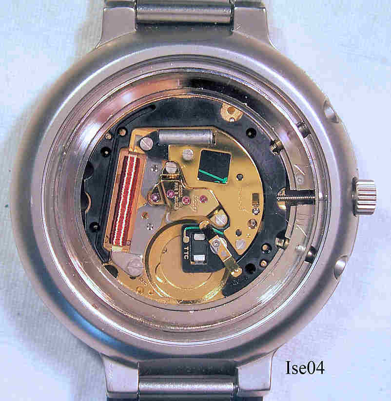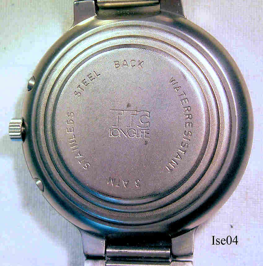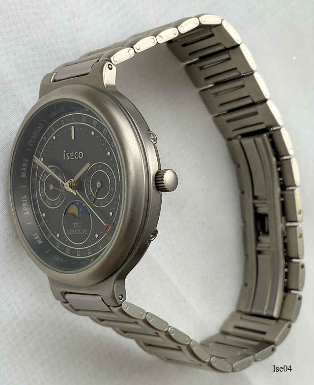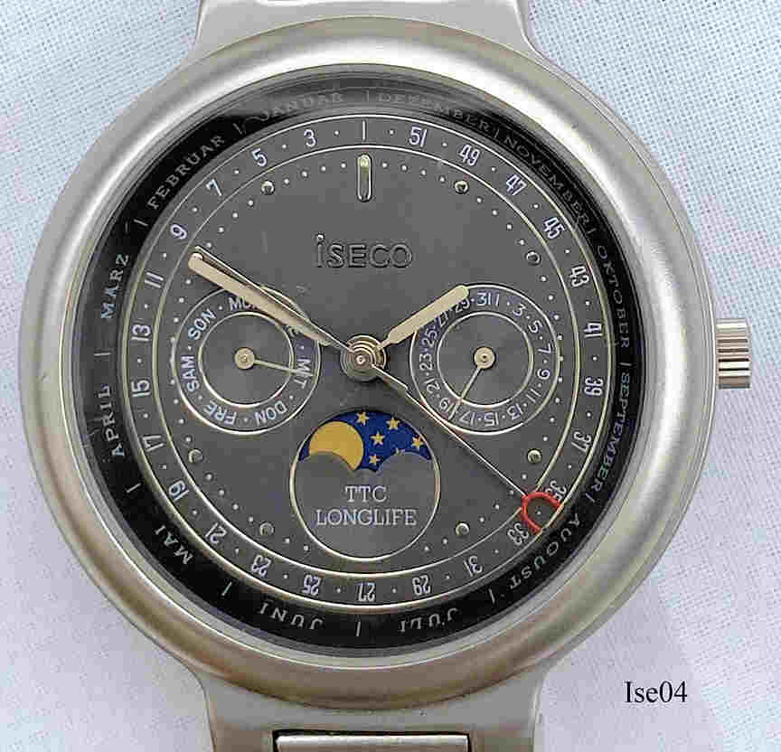 Eine Iseco Uhr mit Woche,Tag, Datum und Mondphase. Die linke Skala zeigt die Wochentage, die Rechte das Datum, die untere zeigt Tag/Nacht, der große Zeiger mit dem roten Halbmond zeigt die Wochennummer und den Monat. Beschriftet vorn: ”Iseco, TTC, Longlife”, hinten: “Stainless Steel Back, Water resistant 3 ATM, TTC Longlife”, innen: ”Harley Ronda, Five Jewels, CBC”. Longlife bezieht sich auf die Lithium Jod Batterie, die die Uhr 20 Jahre Garantiert antreiben soll. Die ganze Rückwand ist die Batterie. Kaliber Harley Ronda CBC