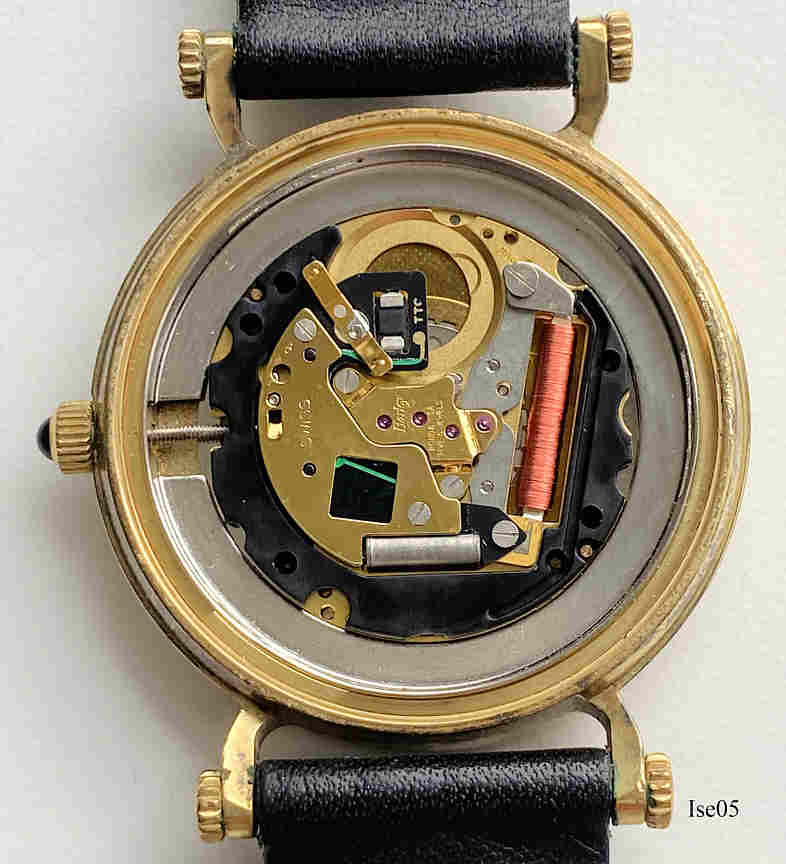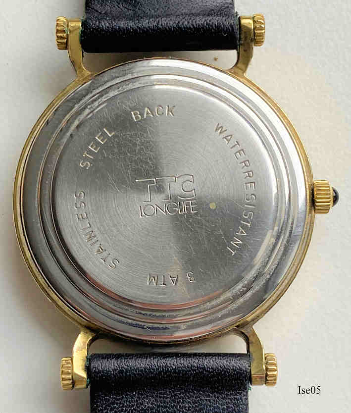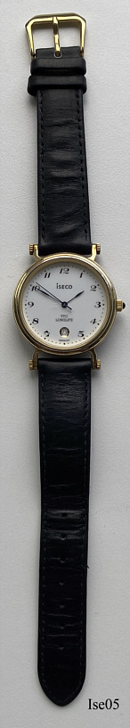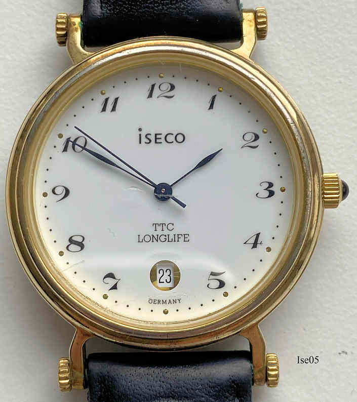 Eine Iseco Herrenuhr mit Datum, passend zur Damenuhr Ise03. Beschriftet vorn: ”Iseco, TTC, Longlife, Germany”, hinten: “Stainless Steel Back, Water resistant 3 ATM, TTC Longlife”, innen: ”Harley Ronda, Five Jewels, DBA”. Longlife bezieht sich auf die Lithium Jod Batterie, die die Uhr 20 Jahre Garantiert antreiben soll. Die ganze Rückwand ist die Batterie. Kaliber Harley Ronda DBA,. Schwarzes Lederband.