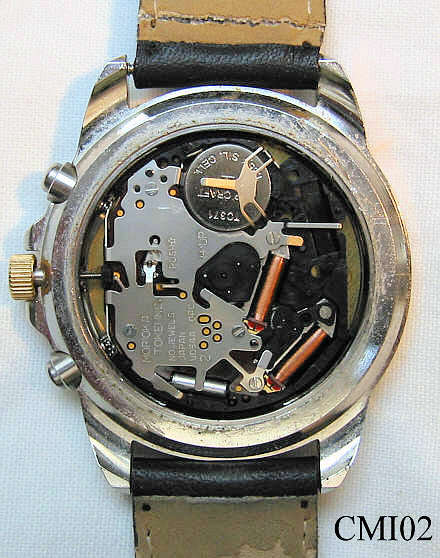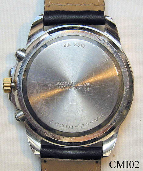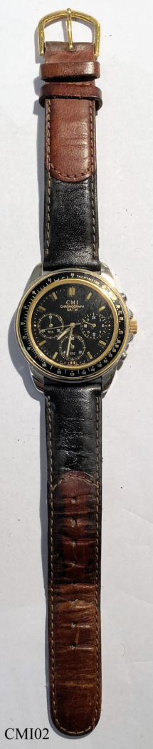 Ein CMI Chronograph mit Edelstahl Gehäuse und Stainless Steel Back. Kaliber Moriota Tokai VD54A, Beschriftung vorn: “CMI, Chronograph, 5 ATM”, Wasserdicht N, DIN 8310, Nr. HAU 706014, Batt. SR920SW”. Zweifarbiges, genähtes Lederarmband braun/ schwarz Funktionen: Stoppuhr mit Anzeige Minuten und Sekunden, Anzeige Stunden im 24 Stunden Modus..