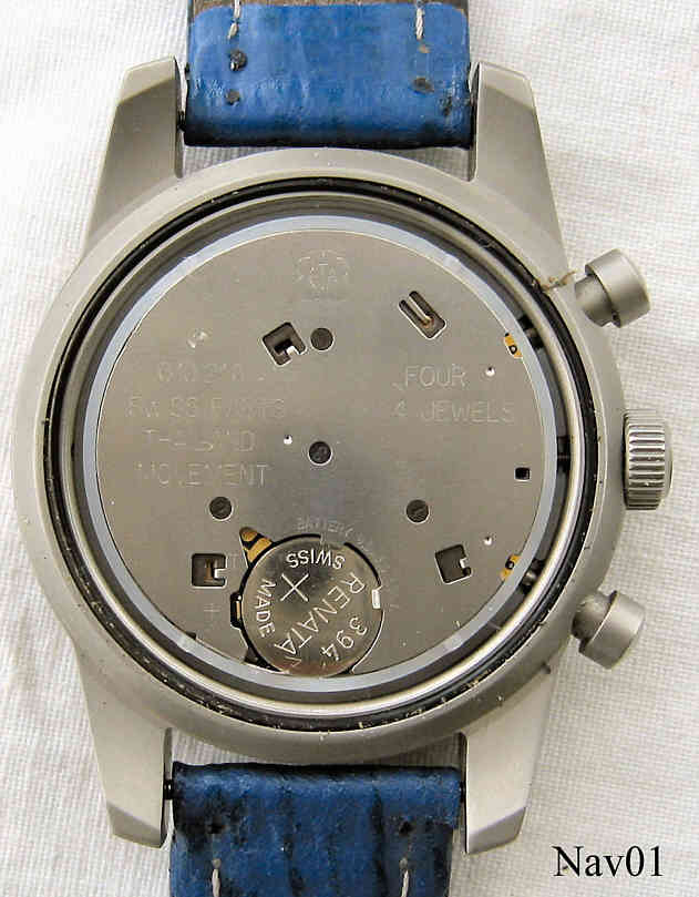 Ein Chronograph mit der Bezeichnung Navigator, Hersteller unbekannt. Beschriftet: “Navigator, Design Chronograph, Water Resist 5 ATM”, hinten: ”Wasserdicht 5 Bar, Edelstahl 316L”, innen: ”ETA, G10.21A, Swiss Parts, Thailand Movement, Four 4 Jewels” . Das Werk ist ein ETA Kaliber G10.21A. Gehäuse im Titan Look, Datum bei der 4.