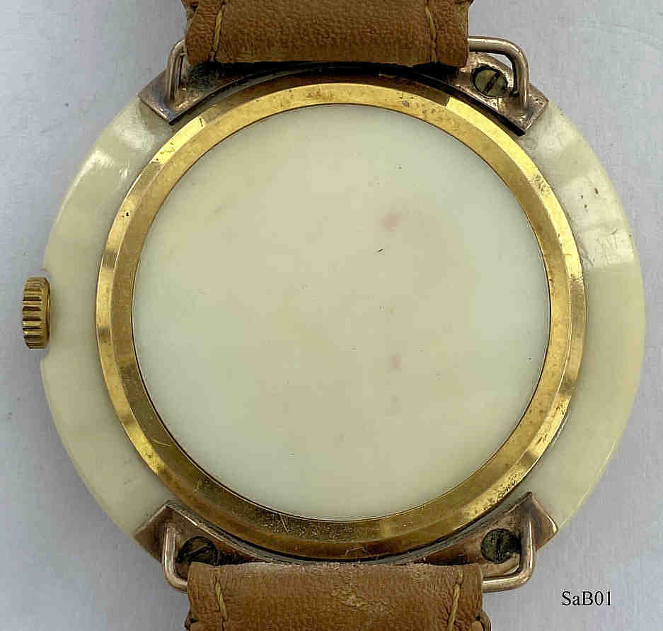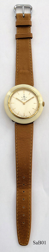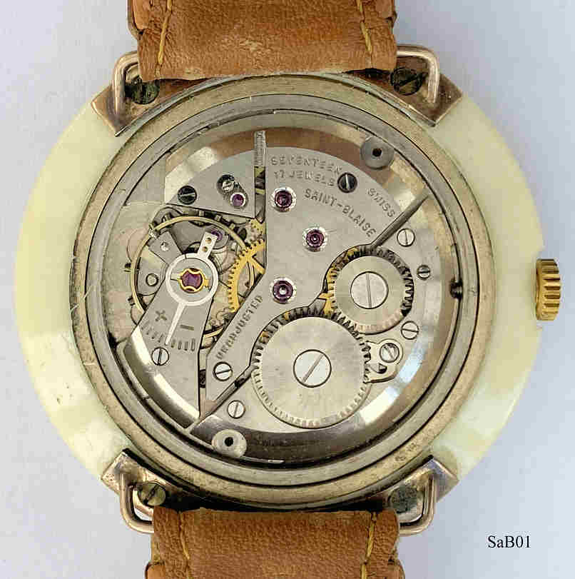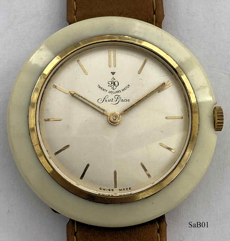 Eine sehr schöne Designuhr der Marke Saint-Blaise mit Handaufzugswerk. Das Gehäuse ist aus Kunststoff, in den die Armbandschlaufen eingeschraubt sind. Beschriftung: “Saint-Blaise, 20 $ Watch, Swiss Made”, innen: ”Seventeen 17 Jewels, Swiss, Saint-Blaise, unadjusted, AS1200”. Uhrwerk Kaliber AS1200. Braunes Leder
