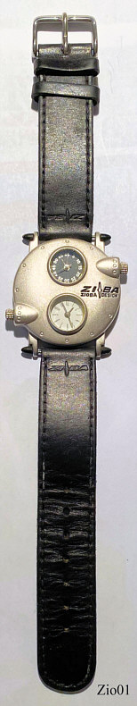 Eine ungewöhnliche Designuhr der Firma Zioba Design. Es sind zwei unabhängige Uhren, damit hat man eine zweite Zeitzone. Das obere Zifferblatt hat eine Minuteneinteilung, das untere eine Stundeneinteilung. Beschriftet: ”Zioba, Zioba Design”, Hinten: ”Zioba Design international, Metal Case Back, Zioba Design, Water Resistant, Japan Movt. ZD-010”, Uhrwerke: 2x Miyota SY30D.