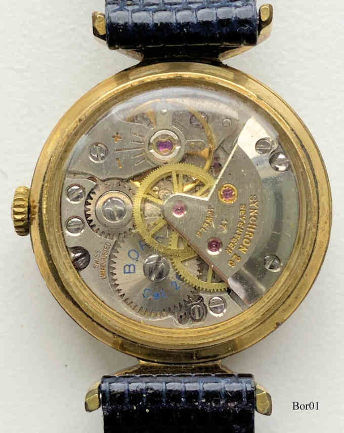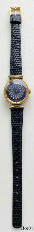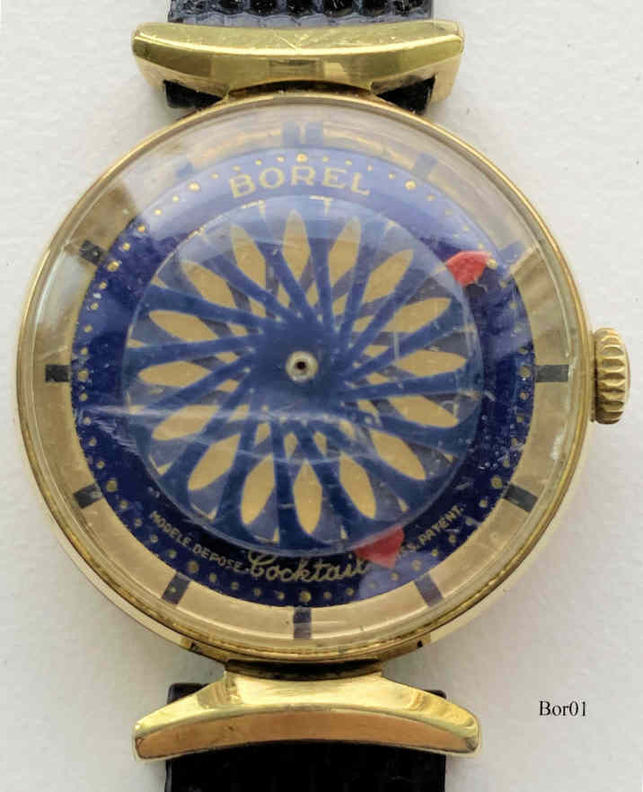 Dies ist eine Borel Handaufzugsuhr der Cocktail Serie mit dem “Mystery” Zifferblatt, bei dem die Sekundenscheibe ein bewegtes Muster erzeugt. Beschriftet vorn: ”Borel, Cocktail, Modčle Deposče, Swiss Patent”, innen: ”Synchron 26, seventeen 17 Jewels, Borel Cal. 26”, Glasboden, schwarzes Lederband.