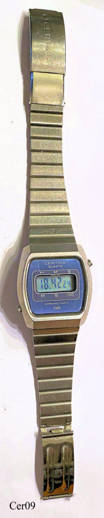 A Certina Chronolympic, a Digitalwatch with LCD Display. Signed front: “Certina, Quartz, Chronolympic, DS”, back: ”Super Shockproof, Water Resistant, DS, 730 1420 41”, inside: “Swiss Made, Certina 780-24, 942711, unadjusted”. Stainless Steel case, Stainless Steel bracelet, Certina clasp.