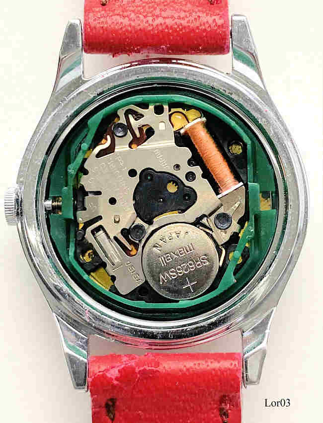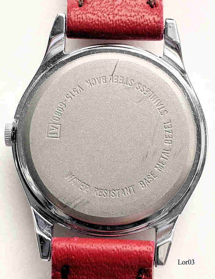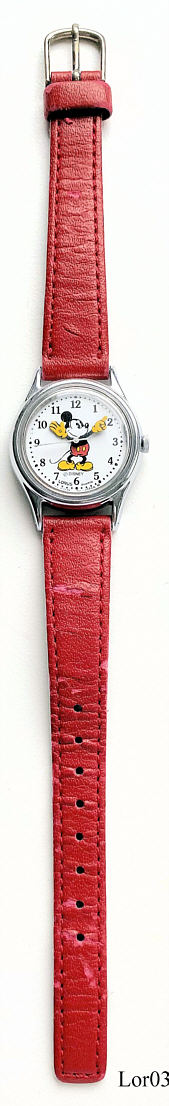 A Lorus Mickey Mouse girls watch on request of Walt Disney with a red leather band. Signed front: ”Lorus, Quartz, V515-6128 HR, Mv’t Japan”, back: “Water resistant, Stainless Steel Back, Base Metal Bezel, V515-6080, A1”, inside: “No Jewels, Unadjusted, Shiojiri Ltd., Japan, V515A”