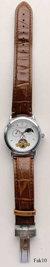 Eine nachempfundene Lange&Söhne Automatic Uhr, wie es sie von Lange in dieser Form gar nicht gibt. Auf dem Zifferblatt oben links eine 24 Stunden Anzeige, rechts eine angedeutete Mondphase, aber auch nur eine Tag/Nacht Anzeige, darunter der Sekundenzeiger sowie die offene Unruhe als Andeutung eines Tourbillons. Beschriftet vorn: ”A.Lange & Söhne,Glashütte i/Sa, Tourbillon”, hinten: ”A. Lange & Sohne Glashutte I/SA AUF...Doppelfederhaus AB Swiss Made”, auf dem Automatic Rotor: ”A.Lange&Söhne, Glashütte SA, Made in Germany”. Braunes Lederarmband mit Faltschließe, signiert.