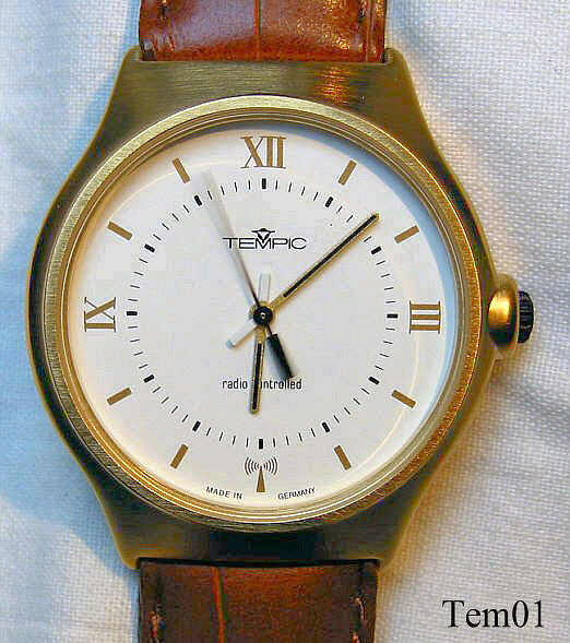 Dies ist eine Herren Funkuhr von Tempic mit römischen Ziffern auf dem weißen Zifferblatt. Die Uhr synchronisiert sich mit dem DCF77 Sender und stellt alle relevanten Daten nach. Das Uhrwerk ist ein Quartzwerk von Ronda, die Empfängerplatine wurde in Ruhla entwickelt und gebaut. Beschriftet vorn: ”Tempic, Radio Controlled”, hinten: ”Kaliber 24, Radio Controlled, Waterresistant, CR1620, CE”, innen: ”HK1051A, MA342”