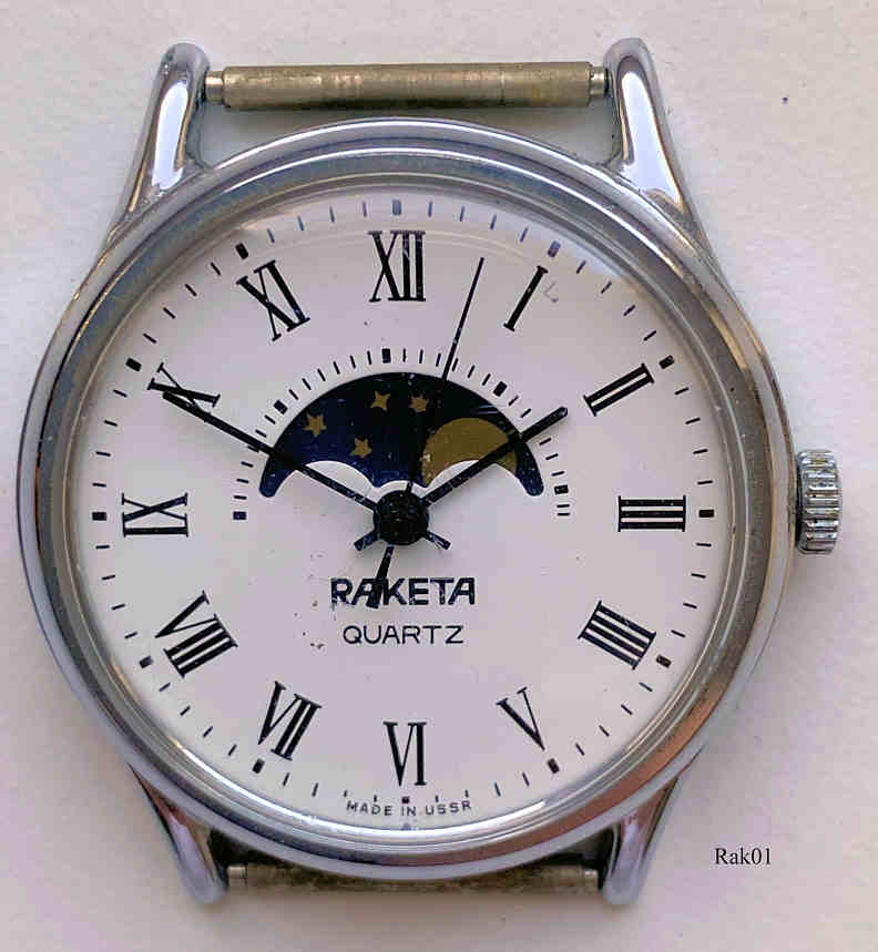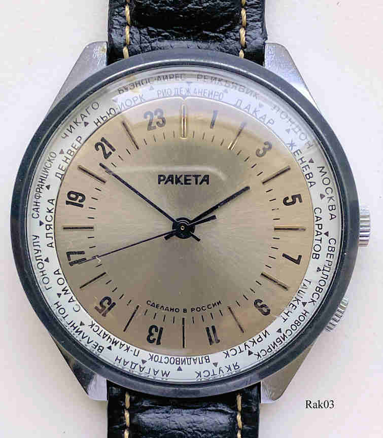 Raketa ist eine Marke von Uhren aus der Sowjetunion, hergestellt seit 1961 von der Uhrenfabrik Petrodworez in Sankt Petersburg. Diese Älteste Überlebende vorkommunistische Fabrik Russlands wurde von Peter dem Großen 1721 gegründet. In ihrer Anfangszeit stellte sie Kunstwerke aus Edelsteinen für den Zaren und seine Familie her. In den achtziger Jahren des letzten Jahrhunderts lief die Produktion mit 4,5 Millionen Uhren pro Jahr. Raketa-Uhren wurden von der Roten Armee verwendet sowie von der Sowjet-Marine. Deren Mitglieder nahmen sie mit auf Polarforschungsreisen und die sowjetische Zivilbevölkerung trug sie ebenso. (Wikipedia)