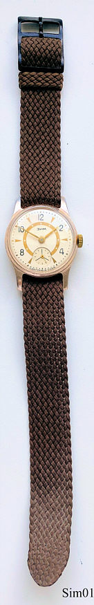 Eine Sim Handaufzugs Uhr der Maslinikower Uhren-Manufaktur. Beschriftung in russisch, also kein Exportartikel. Das Gehäuse ist aus Aluminium, braunes Nylon Armband. Beschriftung vorn: ”SIM, Made in CCCP” beides in Kyrillischer Schrift, innen: “15 Steine, SIM (beides Russisch), 88490”. Werk Pobjeda (ZIM2602, Basis LIP R26)