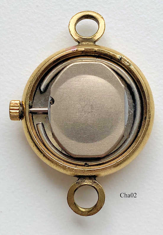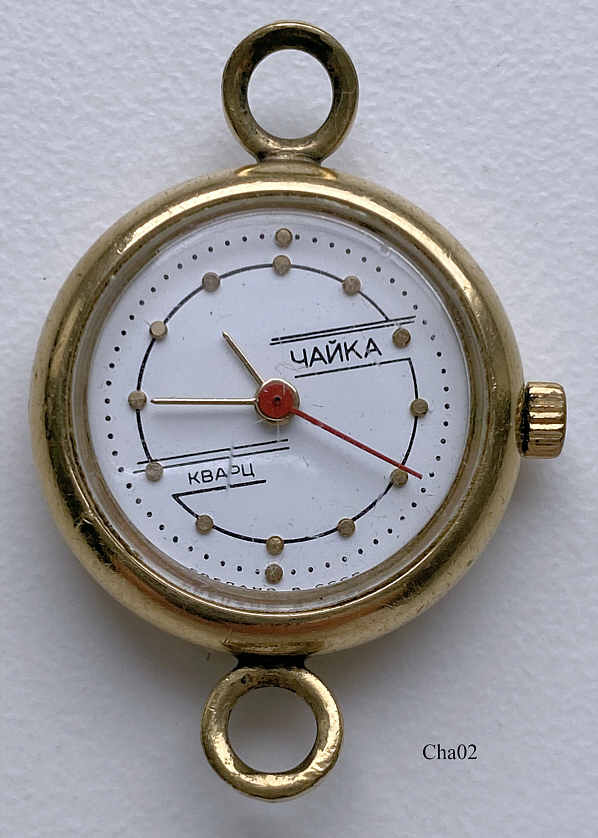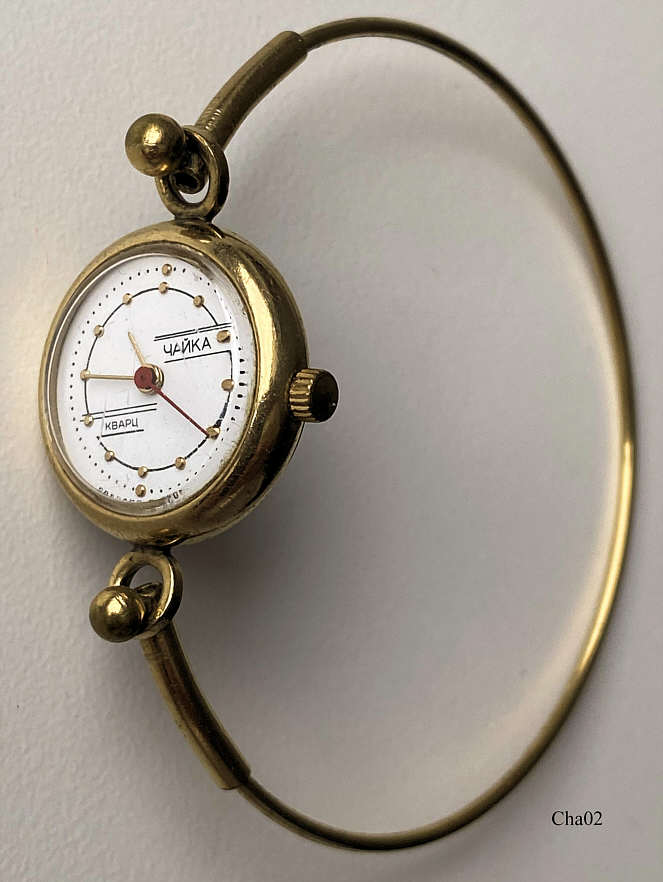 A Chaika ladies quartz watch with fixed metal armring. Base Metal case with stainless steel back. Signed back: “777695”.