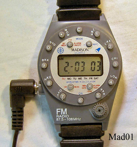 Diese Madison Radiouhr bietet gleichzeitig ein FM Radio, einen Rechner und die Worldtime Zonen an. Das Radio schaltet ein, sobald ein Kopfhörer eingesteckt wird und bietet FM von 87,5 - 108 MHz. Die Senderwahl erfolgt über den Drehknopf rechts unten. Die Rechnerbedienung erfolgt über die Tasten rund um die Digitalanzeige, die Rechenfunktionen sind ober- und unterhalb der Anzeige positioniert. Die World Time Zonen werden ebenfalls über die Tasten rund um die Anzeige ausgewählt. Graues Kunststoffgehäuse und schwarzes Kautschukarmband