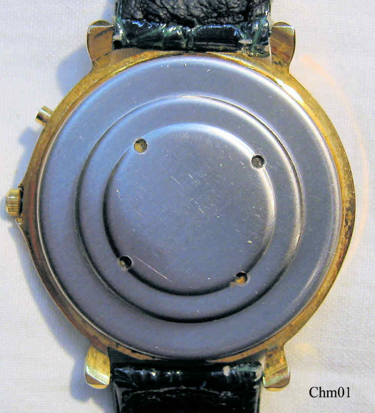 Eine Weihnachtsuhr von unbekanntem Hersteller. Das Zifferblatt hat neben dem Weihnachtsbaum 5 LEDs integriert, die bei Knopfdruck blinken und die Uhr spielt drei Weihnachtslieder über den Lautsprecher in der Rückwand ab. Messing Gehäuse mit schwarzem Lederarmband. Uhrwerk und Effekte werden durch separate Batterien gespeist.