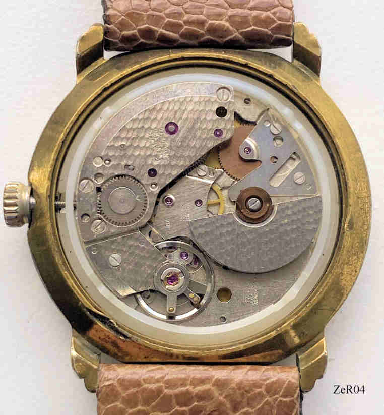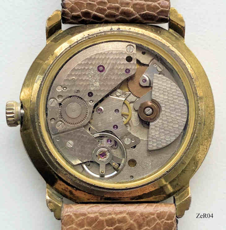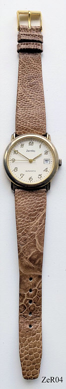 Diese ZentRa Automatic Uhr hat einen Glasboden und ein Automatic Werk 2568 von Harley Ronda mit Micro Rotor. Kalender bei der 3, vergoldetes Gehäuse. Leider ist auf der Vorderseite die Vergoldung stark abgerieben. Bezeichnet vorn: “ZentRa, Automatic”, innen: “22 Jewels, Twentytwo, Unadjusted, Harley Ronda S.A.,2568, Swiss”. Glas Boden, braunes Lederband
