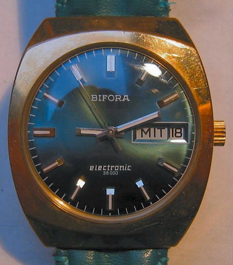 Lederarmband. Beschriftet:” BIFORA, electronic, 36000” hinten:”Stainless Steel Back, Waterprotected, Antimagnetic”