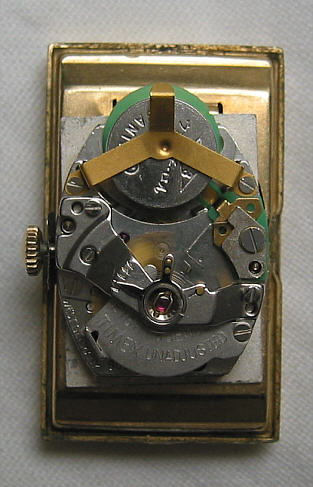 Dies ist eine Damen Laco electric, sie verwendet ein Electric Werk von Timex. Die Unruhe wird über eine elektrisch angesteuerte Spule in ein Magnetfeld gezogen, über Kontakte wird der Stromkreis unterbrochen, die