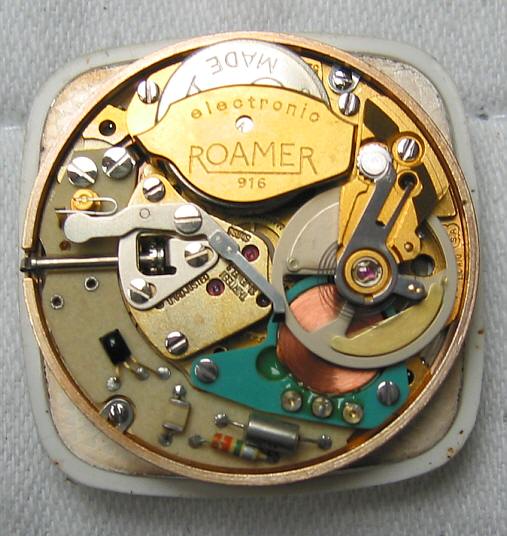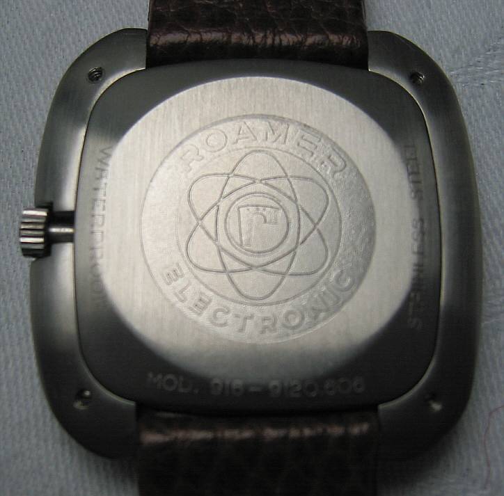 Eine Roamer 506 Electronic Uhr mit ETA Werk, Aufschrift Roamer, electronic, 506. Edelstahl Gehäuse mit braunem Lederarmband. Beschriftet:” Roamer, Electronic, Waterproof, Stainless Steel, MOD. 915-9120506” Date bei der 3.
