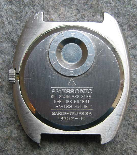 Swissonic Werk, Aufschrift SANDOZ, Electronic, Swissonic. Edelstahl Gehäuse mit schwarzem Lederarmband. Beschriftet:” SWISSONIC, All Stainless Steel, Reg. Des. Patent, SWISS MADE, Garde-Temps S.A.,1830Z-60” Date bei der 3.