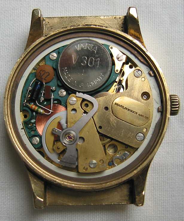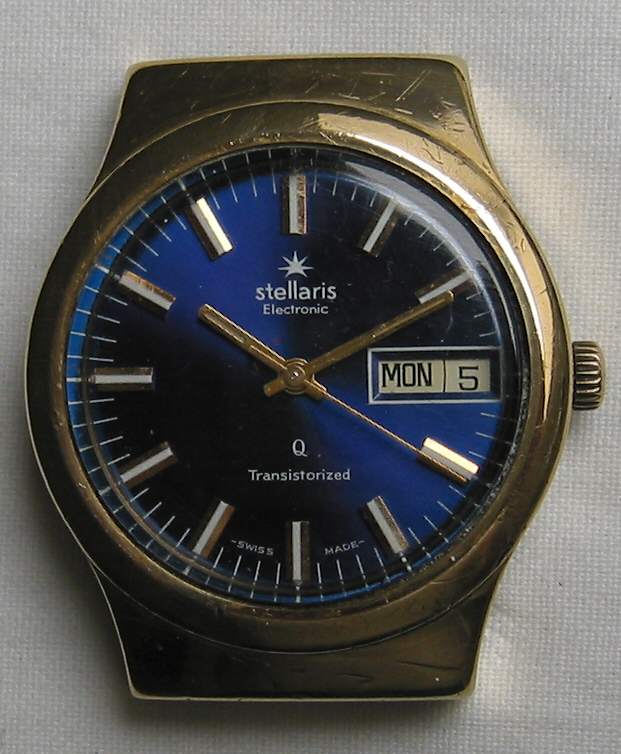 Eine Stellaris Electronic Uhr mit Aufschrift “Stellaris, Electronic,Transistorized”. Stellaris ist wohl die Eigenmarke der Kaufhauskette Sears, Roebuck & Co. Base Metal Gehäuse