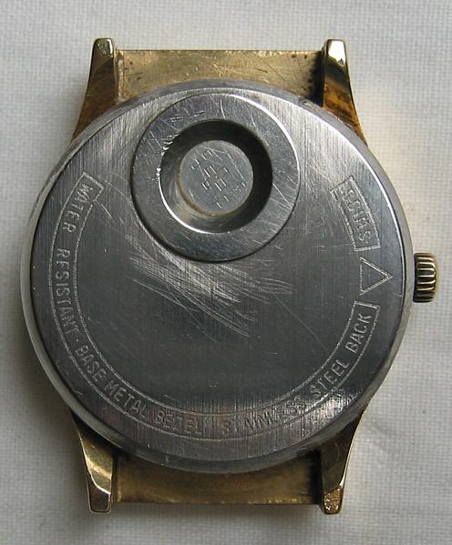 mit stainless steel back. Das Uhrwerk ist ein Swissonic Werk. Beschriftet:” Water Resistant, Base Metal Bezel, Stainless Steel Back, Swiss” Day / Date bei der 3.