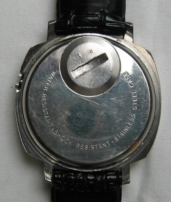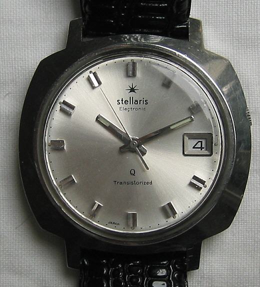 Eine Stellaris Electronic Uhr mit Aufschrift “Stellaris, Electronic, Transistorized”. Edelstahl Gehäuse mit schwarzem Lederarmband. Beschriftet:” Water Resistant, Shock Resistant, Stainless Steel Case, R 3”