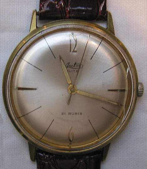 Dies ist eine Arctos Elite mit 21 Steinen als Handaufzugsuhr. Beschriftet:”Arctos, Elite, 21 Rubis” Rückseite:” RP, Waterproof, Discu-Safe, Pat. - DB. Pat.”. Gehäuse Base Metal, dunkel rotes Lederarmband.