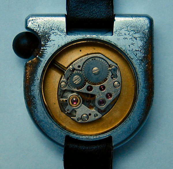 Diese extravagante Damen Armbanduhr wurde von Lip unter der Bezeichnung Ecusson herausgebracht, hier abgebildet als Logo-Produkt für Dugena. Das ungewöhnliche Design ist von Roger Tallon. Das Uhrwerk ist ein LIP T13.