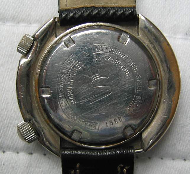 die untere Krone stellt die Weckzeit ein und zieht den Wecker auf. Der rote Zeiger zeigt die eingestellte Weckzeit an. Beschriftet: ”Shockprotected, Swiss made, Waterprotected, Steel Back, Manufactured in