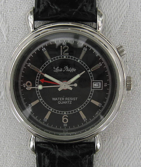 Eine Louis Phillippe “Presidents Watch” mit Stainless Steel Gehäuse und verschraubtem Stainless Steel Back, eine Quartz Uhr mit Weckeinrichtung. Beschriftet:” Lois Phillippe, Water Resist, Quartz”, hinten “ The