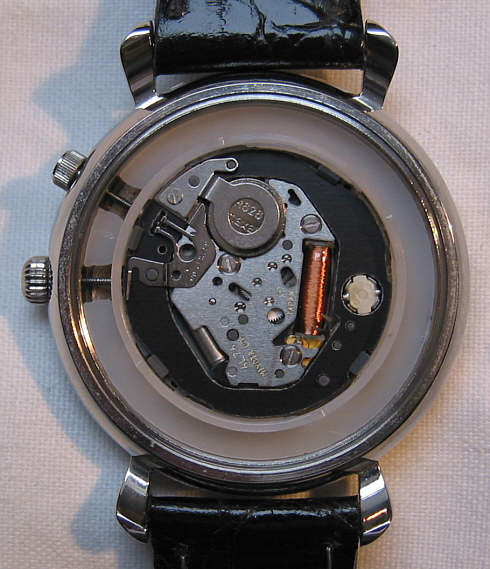 Presidents Watch, Stainless Steel”. Innen läuft ein Quartzwerk der Firma Miyota, Kaliber 6L76. Die Krone über der “2” dient zum ein und ausschalten des Weckers, die Weckzeit wird mit dem roten Zeiger eingestellt,