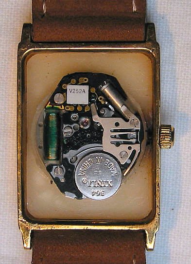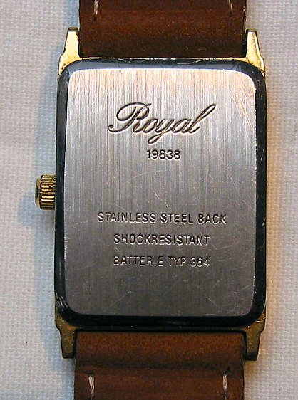 Eine sehr schöne Quartzuhr von Royal im Stile der 50er Jahre. Goldfarbiges Gehäuse mit braunem Lederarmband. Beschriftet:” Royal - Quartz”, Rückseite:” Royal, 19838, Stainless Steel Back, Shockresistant, Battery Typ 364”.