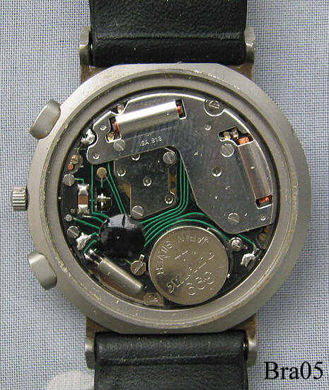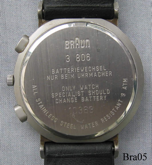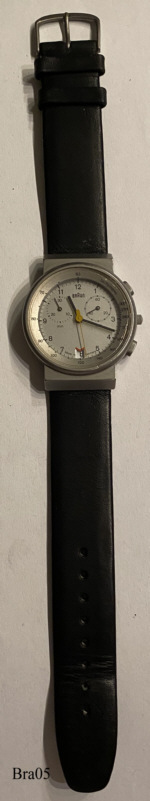 Dies ist ein Braun Chronograph Typ AW60 in matt silberner Ausführung. Die Braun Uhren zeichnen sich durch ein sehr klares und geradliniges Design von Dietrich Lubs aus. Beschriftet vorn: ”Braun, Made in Germany”, hinten: ”Braun, 3 806, Batteriewechsel nur beim Uhrmacher, Only Watch Specialist should change Battery, 10363, All Stainless Steel, Waterresistant, 3 ATM”, Caliber ISA818.