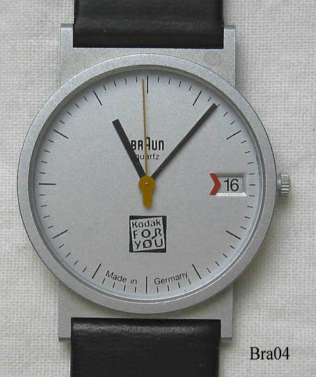Dies ist eine Braun Uhr Typ AW20 in matt silberner Ausführung mit Werbeaufdruck: “Kodak for you”. Die Braun Uhren zeichnen sich durch ein sehr klares und geradliniges Dietrich Lubs Design aus. Beschriftet vorn: ”Braun, Quartz, Kodak for you, Made in Germany”, hinten: ”Braun, 3 602, Stainless Steel Back, Waterresistant”