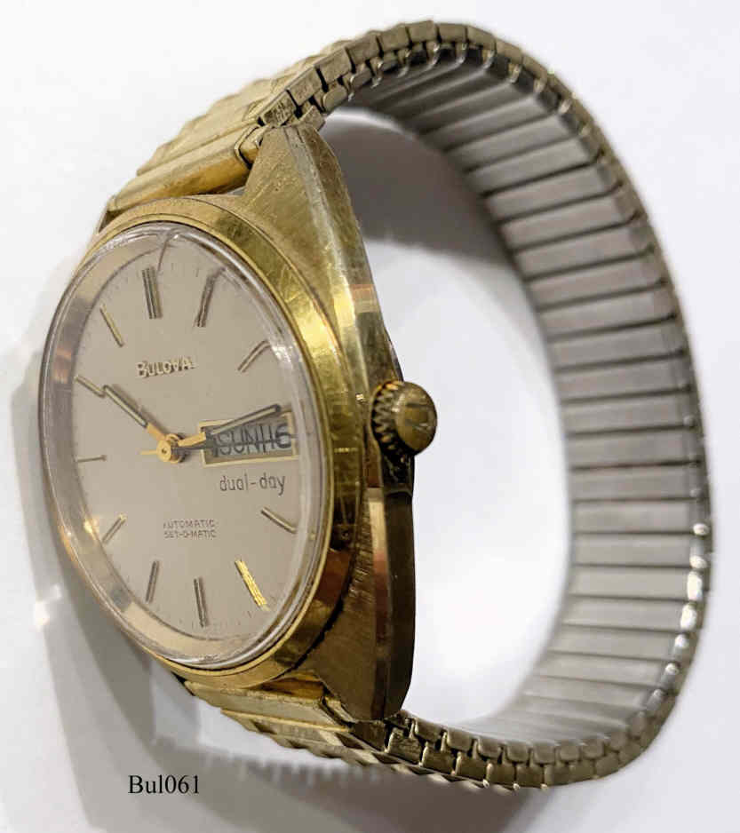 Eine Bulova Set-O-Matic Dual Day Automatic Uhr in Base Metal Gehäuse, 17 Jewels, Beschriftet vorn: ”BULOVA, dual-day, Automati, Set-O-Matic”, Rückseite: ”Bulova, N9, Base Metal Bezel, Stainless Steel Back, Water Resistant”, Innen: ”Bulova Watch Co.,1353.10, seventeen 17 Jewels, unadjusted, N9”, Caliber 1353.10, Herstelldatum 1979 (N9). Das Werk ist ein Caliber 1663S von PUW.