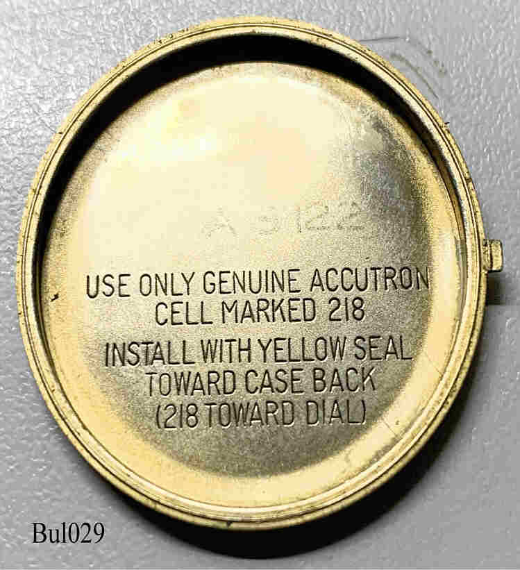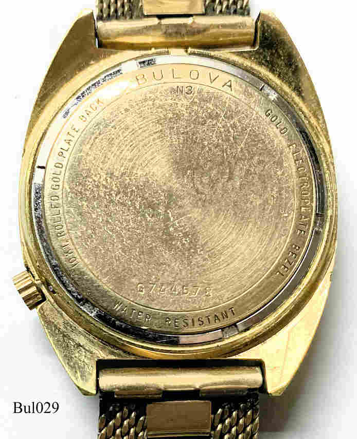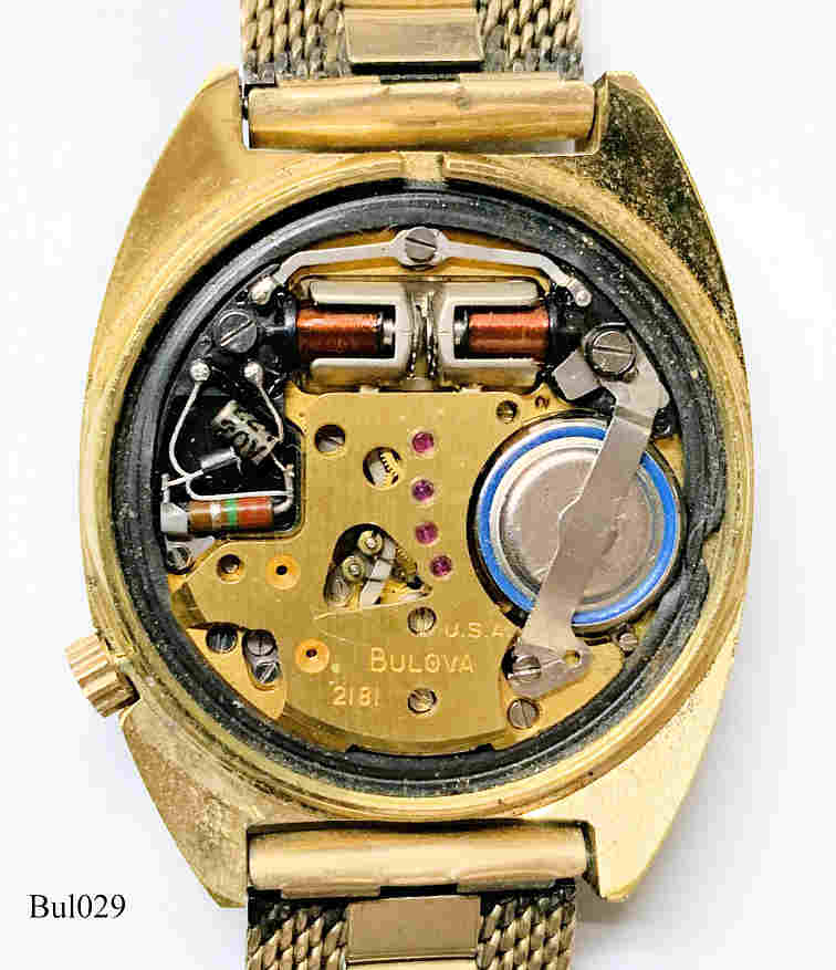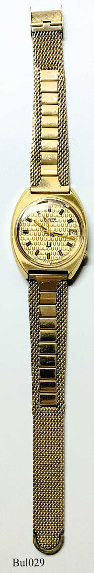 Bulova Accutron with gold plated case, signed front: “Bulova, Accutron”, back: ”Bulova, gold electroplate bezel, Water Resistant, 10 Kt rolled Goldplate Back, G744578, N3”, inside: “USA, BULOVA, 2181”, Case # A3122, Caliber 2181, manufacturing date 1973 (N3), screw-on back, date in gold at 3, crown at 4, very dressy Duchess metal band. The dial is matte gold with polished tuning fork symbols all over. Number bars in black/gold/black, hands also in black/gold.