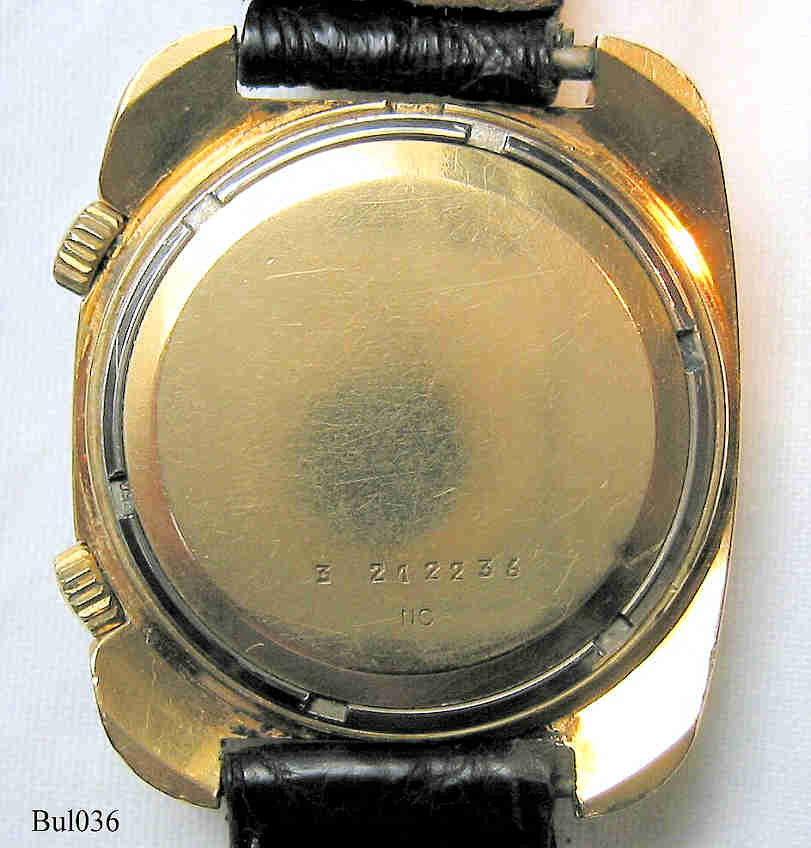 Bulova Accutron Astronaut II with rectangular 18K Gold case and sweep second hand, golden dial, Date at 3, signed front: “BULOVA, Accutron, Astronaut, Mark II”, back: “3 212236, N6”, inside: “U.S.A., Bulova, 2185”, Case # 901, Caliber 2185, Herstelldatum 1976 (N6), Nr.3 212236, black leather band. This caliber has a quick advance for the hours via the second crown at 2, so you can easily adjust the second time zone. The window at six shows the difference to the local time.
