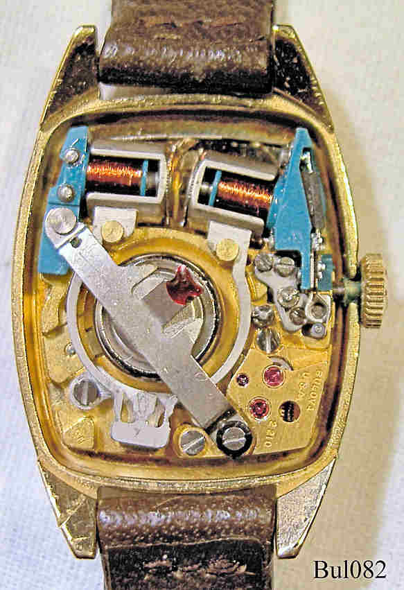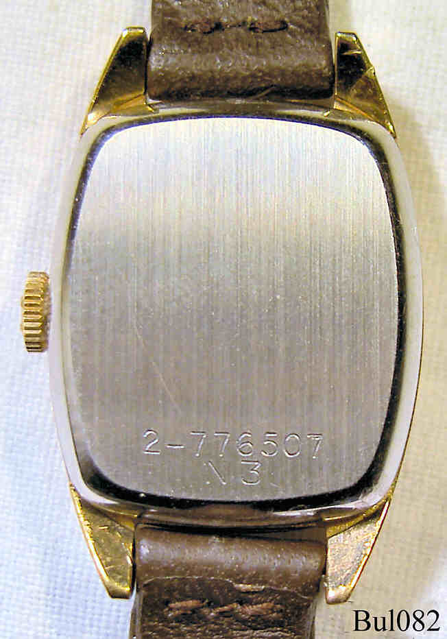 Eine Bulova Damen Accutron mit Base Metal Gehäuse, Beschriftet vorn: “Bulova, Accutron”, hinten: “2- 776307, N3”, innen: “Bulova, USA, 2210, N3”, Caliber 2210, Herstelldatum 1973 (N3), dunkelbraunes Lederarmband.