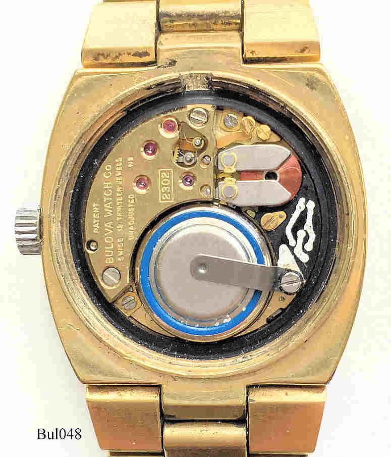 Eine Bulova Accutron Damenuhr mit vergoldetem Gehäuse im TV Look, Beschriftet vorn: “Bulova, Accutron”, hinten: “2-886470, Bulova, Stainless Steel, patented, Water Resistant”, innen: “Patent, BulovaWatch Co., Swiss 13 Thirteen Jewels, Unadjusted N3, 2302”, Caliber 2302, Herstelldatum 1973 (N3), Datum bei der 3, schweres, vergoldetes Metallglieder Armband mit Bulova Schließe.Modell 204 01 16