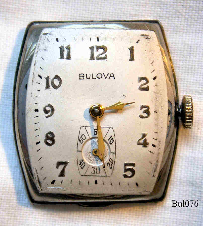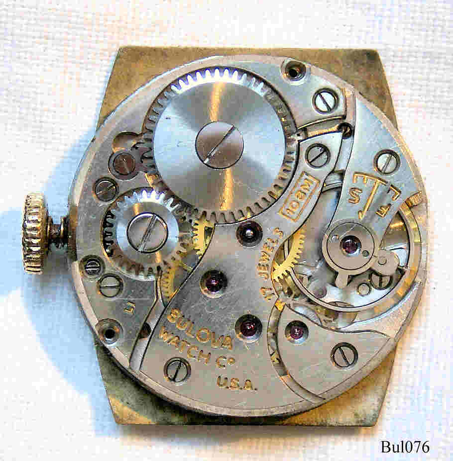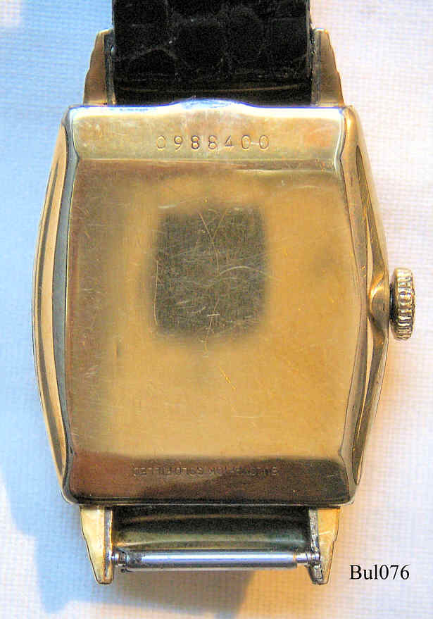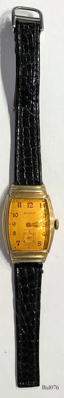 A Bulova Handwinding watch with gold plated art deco case and yellow glas, signed front: “Bulova” back: “Bulova, 10K Gold filled, 0988400”, inside: ”Bulova Watch Co., U.S.A.,17 Jewels, 10BM, L1”, Caliber 10BM, Date of production 1951 (L1), black Leather strap with neutral clasp.