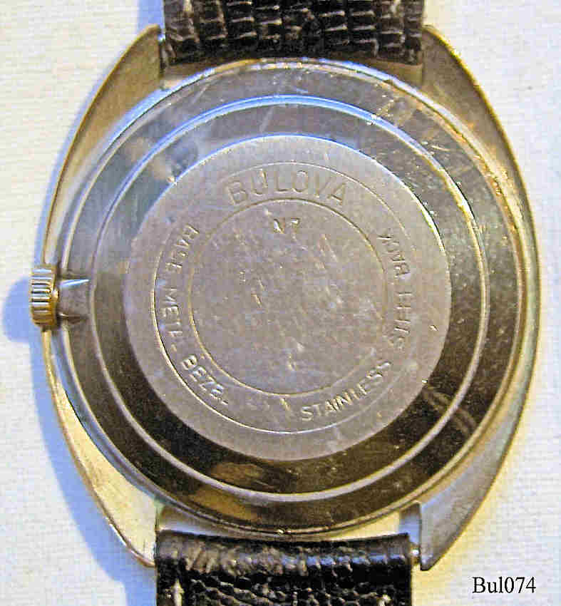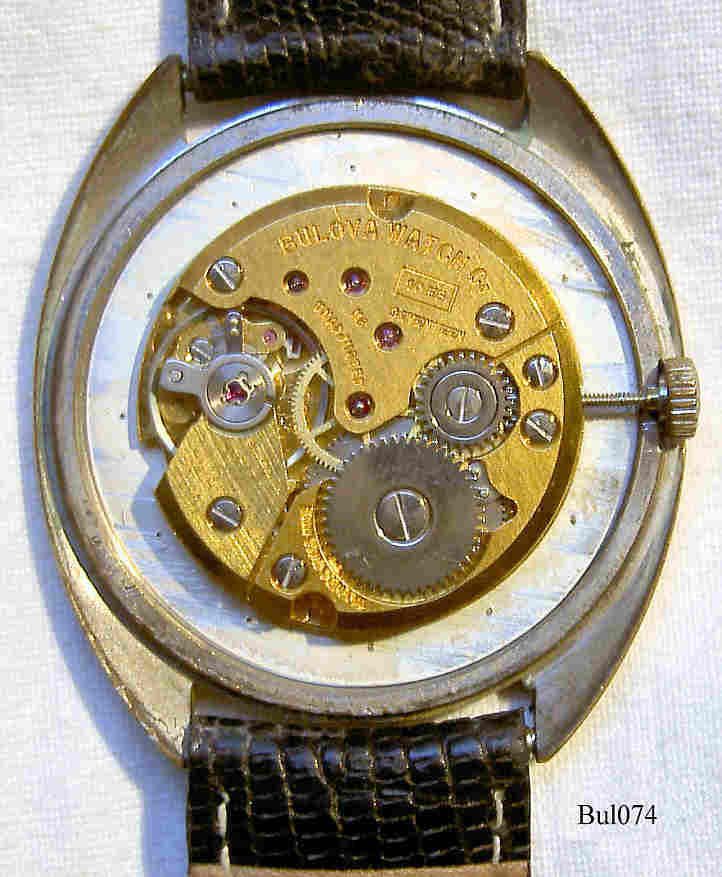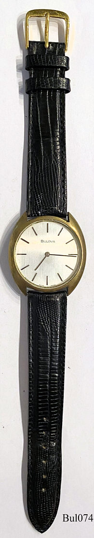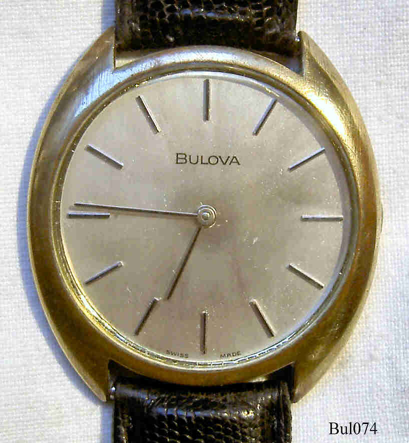 A Bulova Handwinding watch with gold plated case, signed front: “Bulova” back: “Base Metal Bezel, Bulova, N7, Stainless Steel Back”, inside: ”Bulova Watch Co., 10EB, Seventeen, N6, unadjusted, seventeen Jewels Swiss Made”, Caliber 10EB, Peseux 7040, Date of production 1977 (N7), movement 1976 (N6), stainless steel back, Leather strap with neutral clasp.