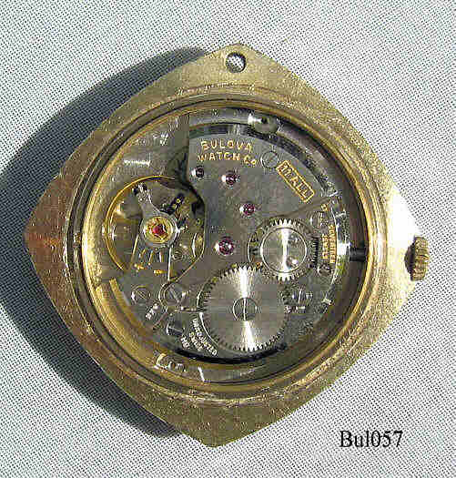 A Bulova Handwinding watch to be carried on a neck chain, signed front: “Bulova, Swiss”, inside: ”Bulova Watch Co., 11ALL, 17 seventeen Jewels, Unadjusted Swiss, M6”, Caliber 11ALL, Date of production 1966 (M66), base metal back.