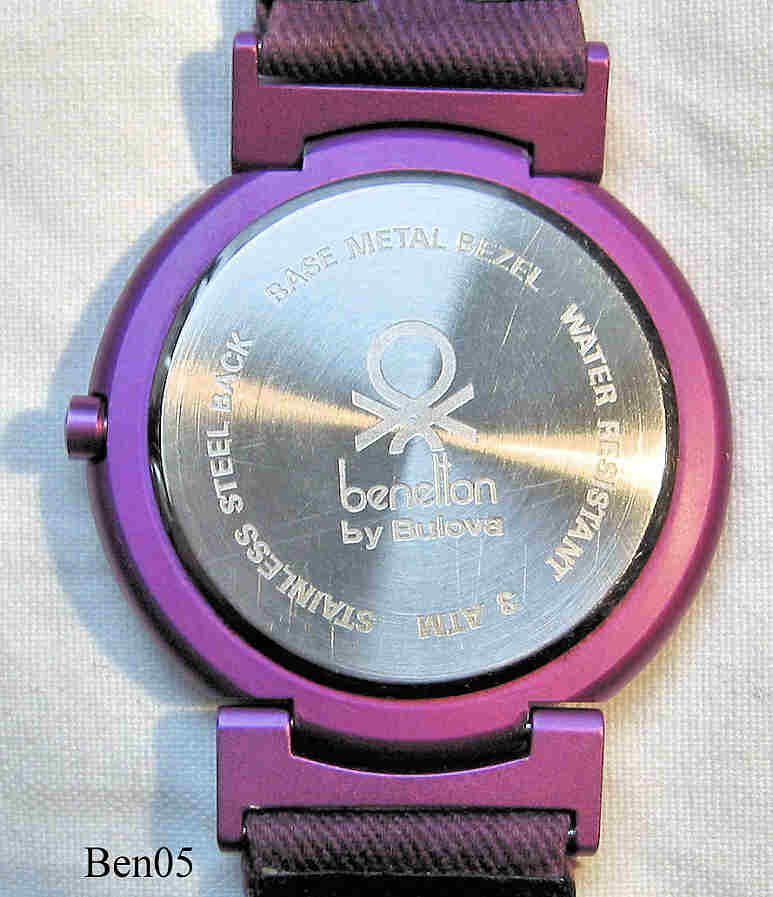 Benetton by Bulova in crazy pink, signed front:”Benetton by Bulova” back:”Benetton by Bulova, Stainless Steel Back, Water Resistant, 3 ATM, Base Metal Bezel”, pink textile strap with Benetton clasp.