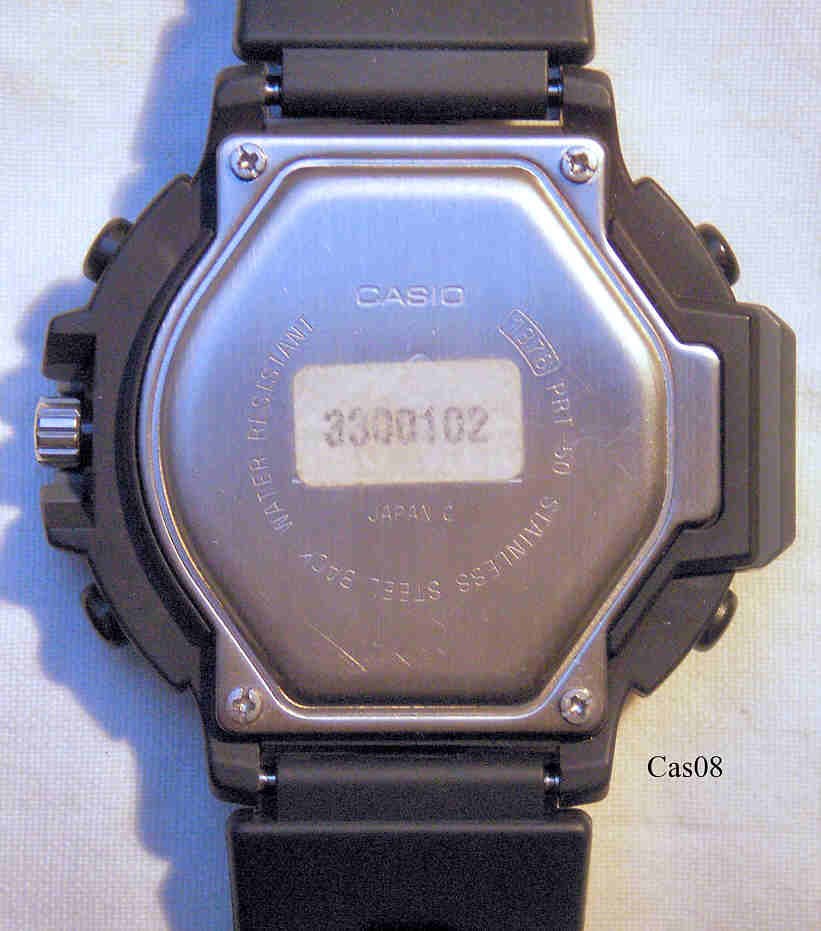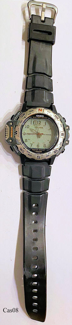 A Casio digital watch with multiple functions: Day - Date - Time (Foto), Compass, Altitude meter, Air pressure meter, Alarm, Stop watch. Caliber Casio 1376. Signed front: ”CASIO, Twincept Twinsensor, Auto Light Switch, Water Resist 100m, Mode, Adjust, Light, Memory, Select, Hold clear, Hold Light on/off”, back: ”CASIO, 1376, PRT-50, Stainless Steel Back, Water Resistant, Japan C”. The LCD display is integrated in the glas on top of the analog watch. The selected function is shown in the upper, the time in the lower part of the display. Plastic case and rubber band.