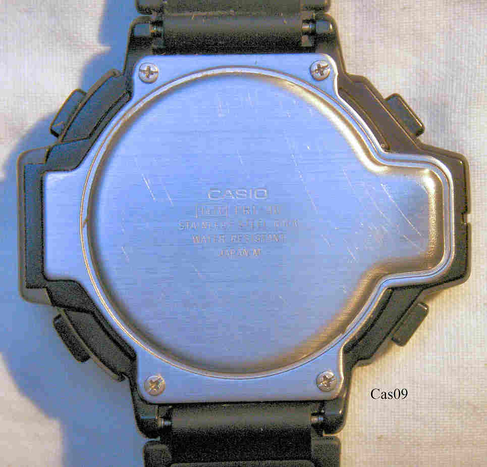 Eine Digitaluhr von Casio mit diversen Funktionen. Folgende Funktionen sind eingebaut: Tag-Datum-Uhrzeit (Foto), Kompass, Höhenmesser, Barometer, Alarm, Stoppuhr. Caliber Casio 1470. Beschriftet vorn: ”CASIO, ProTec, Auto Light Switch, Water Resist 100m, Mode, Adjust, Bearing, Memory, Tuning, Select”, hinten: ”CASIO, 1470, PRT-40, Stainless Steel Back, Water Resistant, Japan M”. Die LCD Anzeige zeigt im unteren Teil die Zeit und im oberen Teil die jeweilige Funktion. Kunststoff Gehäuse mit Kautschuk Armband.