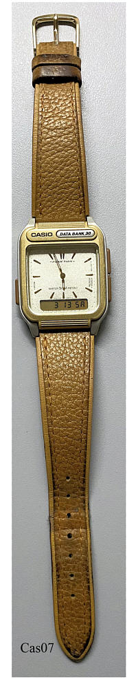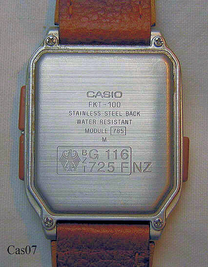 Dies ist eine Funkuhr von Casio mit Datenbank. Die Uhr synchronisiert sich jeweils um 2:00 und um 4:00 Uhr mit dem DCF77 Sender und stellt alle relevanten Daten nach. Beschriftet vorn: ”Funk Tion, Water 50M Resist, Made in Japan”, hinten: ”Casio, FKT - 100, Stainless Steel Back, Water Resist, Module 785, M, Funkschutzzeichen: BZT, G116, 725 F, NZ”