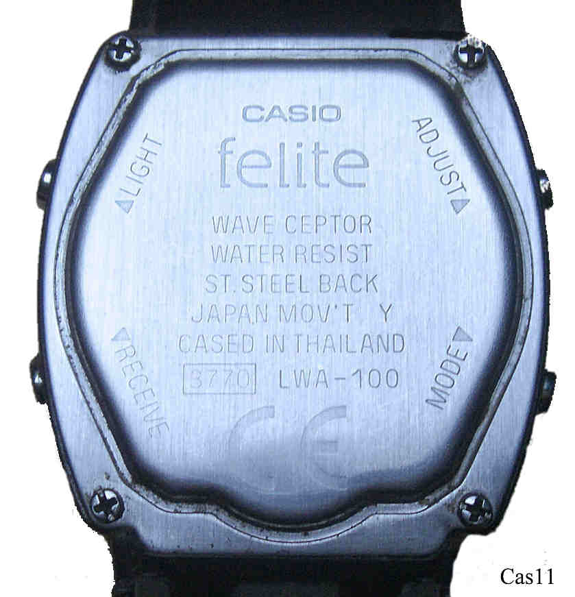 Dies ist eine Funkuhr von Casio mit Weltzeitfunktion. Die Uhr synchronisiert sich jeweils um 2:00 und um 4:00 Uhr mit dem DCF77 Sender und stellt alle relevanten Daten nach. Beschriftet vorn: ”Felite” hinten: ”Casio, Felite, Wave Ceptor, Water Resist, St Steel Back, Japan Mov’t, Cased in Thailand, 3770 LWR - 100”