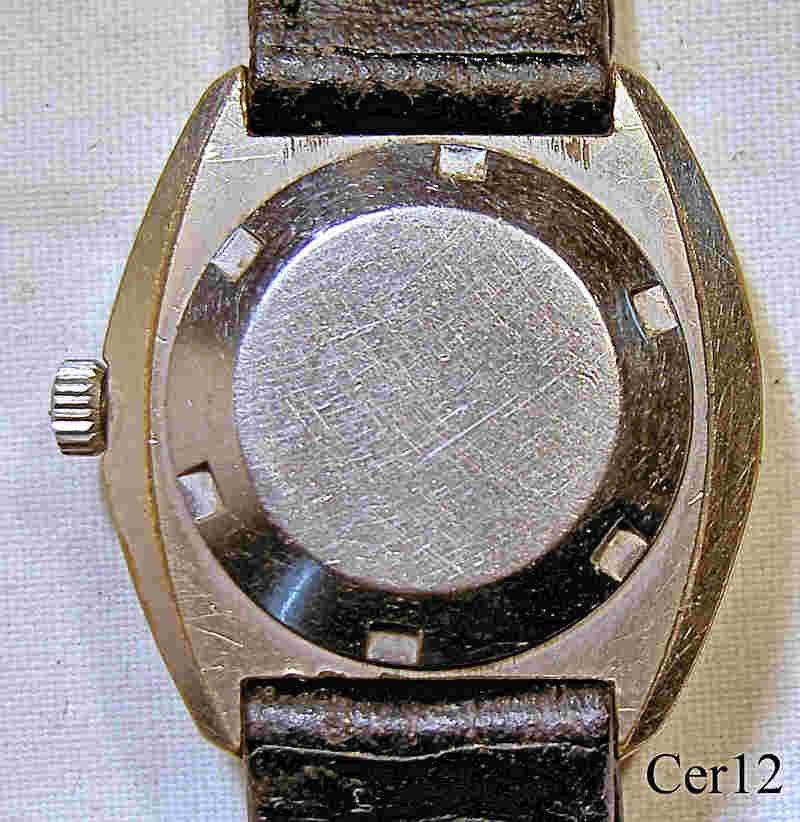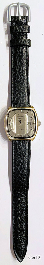 Dies ist eine Certina Damen Automaticuhr mit Datum bei der 3, Caliber 17-351 mit 27 Steinen, verchromtem Messinggehäuse und schwarzem Lederarmband. Beschriftet vorn: ”Certina, Automatic, Festival, Swiss Made”, innen: ”Certina, 17-351, 27 Jewels, Swiss”, hinten: ” ”. Leider zeigt das Gehäuse schon starken Abrieb, Zifferblatt und Werk sind sehr gut erhalten.