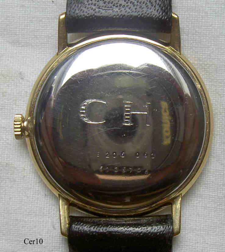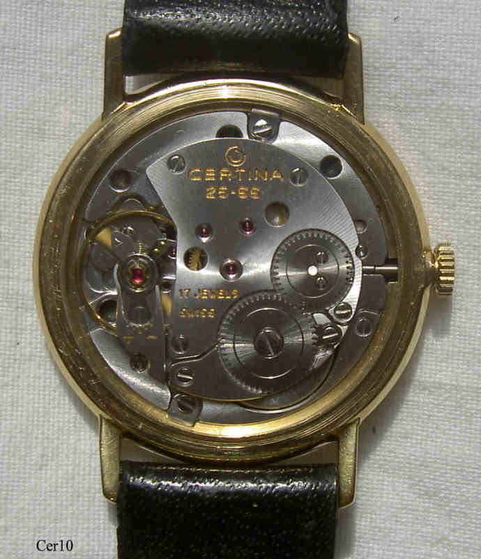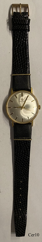 Dies ist eine wunderschöne Certina Handaufzugsuhr, Caliber 25-66 mit 17 Steinen, f=19800 A/h, 48 Std Gangreserve. Vergoldetes Gehäuse und schwarzes Lederarmband. Beschriftet vorn: ”Certina”, innen: ”Certina, 25-66, 17 Jewels, Swiss”, hinten: ”5 206 063, 6135706 und Gravur CH”. Diese Uhr ist ein Geschenk von Jos Freylinger bei seinem Besuch in Taaken 2006.