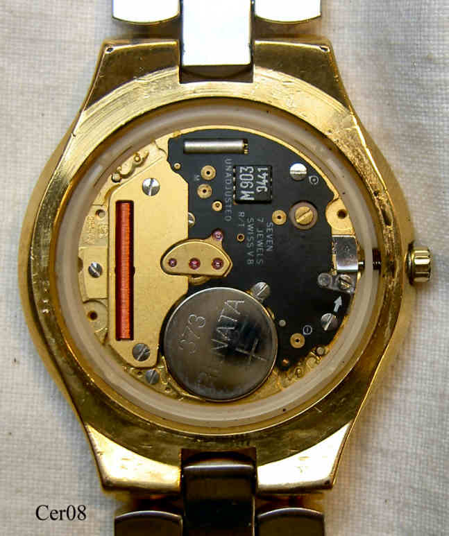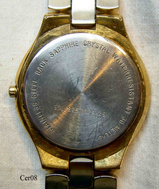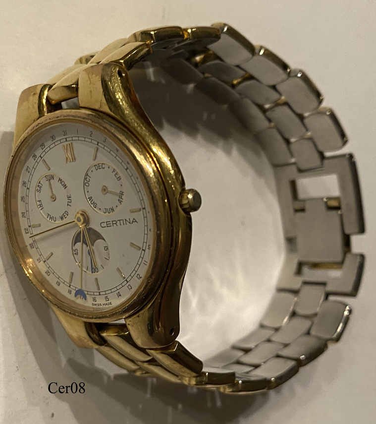 Dies ist eine Certina Quartz Uhr mit Mondphase und Zeiger-Kalender, beschriftet: ”Certina, Swiss Made”, innen: ”seven 7 Jewels, Swiss V B, R/T, unadjusted, M”, hinten: ”Stainless Steel Back, Sapphire Crystal, Water Resistant 30 Meters, EOL 225 1024 26”. Gehäuse Base Metal, Kaliber ESA 255.483. Auf dem Zifferblatt befinden sich 3 zusätzliche Anzeigen: Wochentag, Monat und Sekunde mit Mondphase, das Datum wird über den Zeiger mit blauem Halbmond angezeigt.